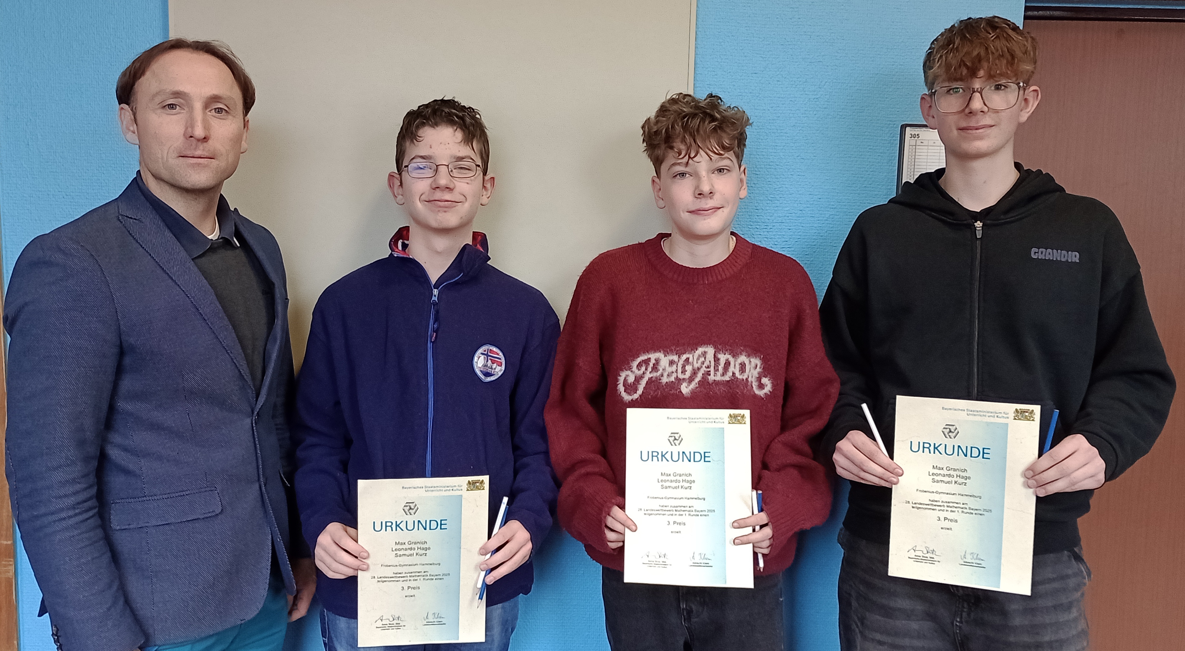 Max Granich, Leonardo Hage und Samuel Kurz aus der 9a haben als Team für 4 Aufgaben Lösungen eingereicht und konnte 9 von 16 Punkten damit erringen. Dafür erhielten sie eine Urkunde für den 3. Preis, zwei Landeswettbewerb-Bleistifte und die Anmerkungen zu ihren Lösungen. Die drei freuten sich sichtlich über ihren Erfolg.