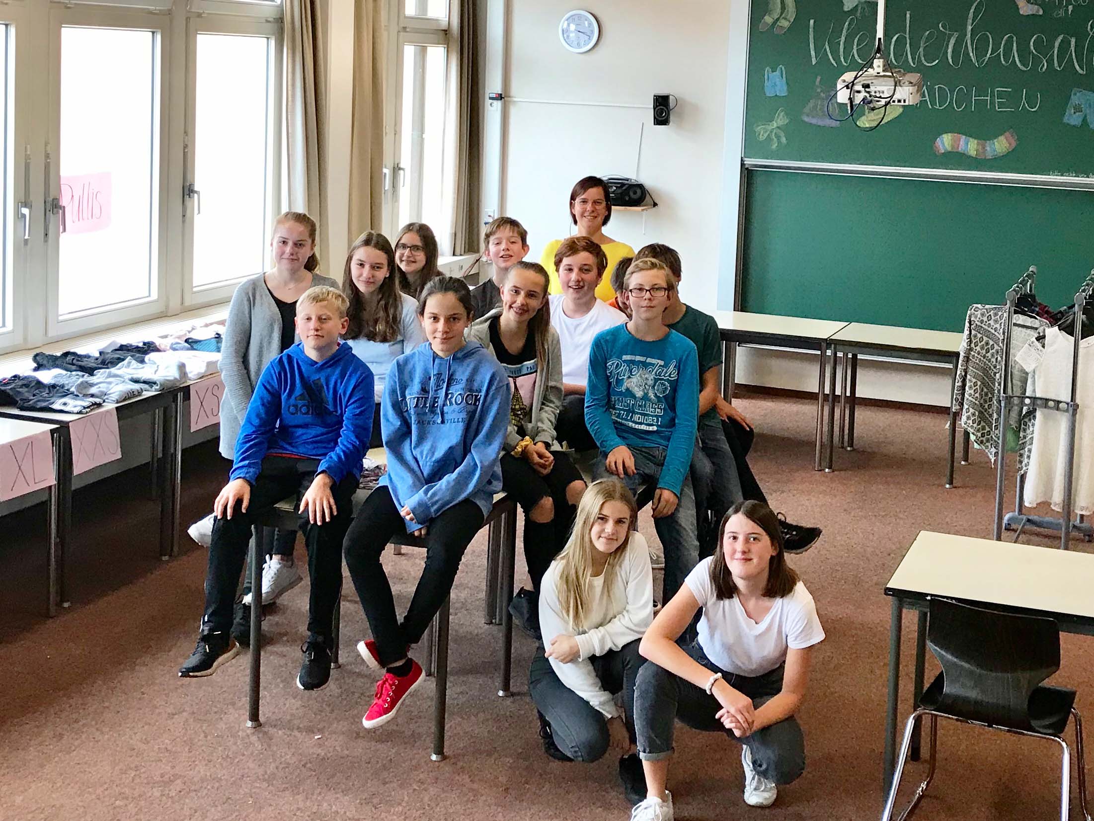 Mit großem Engagement sortieren die Schülerinnen und Schüler mitgebrachte Kleidung und verwandelten das Klassenzimmer in einen großen Basarraum. Die Rückmeldung war durchaus positiv, so dass es den Schülerinnen und Schülern gefallen hat dieses sinnvolle Projekt selbstständig zu planen und durchzuführen und nebenbei noch etwas Neues für den eigenen Kleiderschrank zu bekommen.