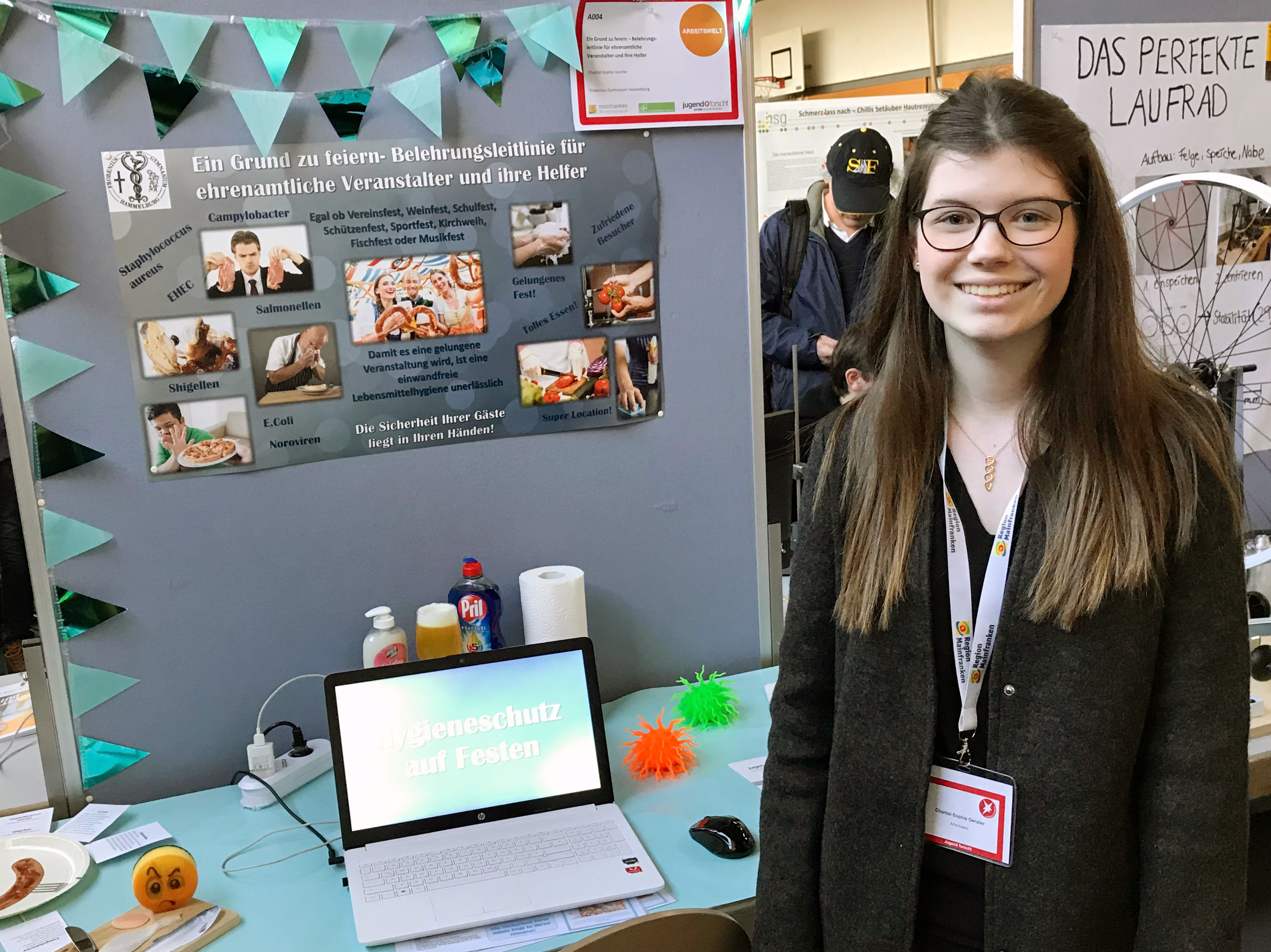 Chantal-Sophie investierte sehr viel Zeit und intensive Recherche in ihr Projekt und wurde neben dem „Thinking Safety“-Preis mit dem 3. Platz in dem Fachgebiet „Arbeitswelt“ prämiert. Ebenfalls bemerkenswert ist, dass Chantal-Sophie schon während ihrer Forschungszeit mit dem Gesundheitsamt Bad Kissingen in Kontakt stand und die MitarbeiterInnen geschlossen hinter dem Projekt stehen. Sie unterstützen Chantal-Sophie sehr und so wird ihre Präsentation auch auf der Homepage des Landratsamts veröffentlicht. Ein toller Beitrag, der hoffentlich von vielen Personen genutzt wird und als eine erhebliche Erleichterung für ehrenamtliche Veranstalter von Festen gesehen werden kann.